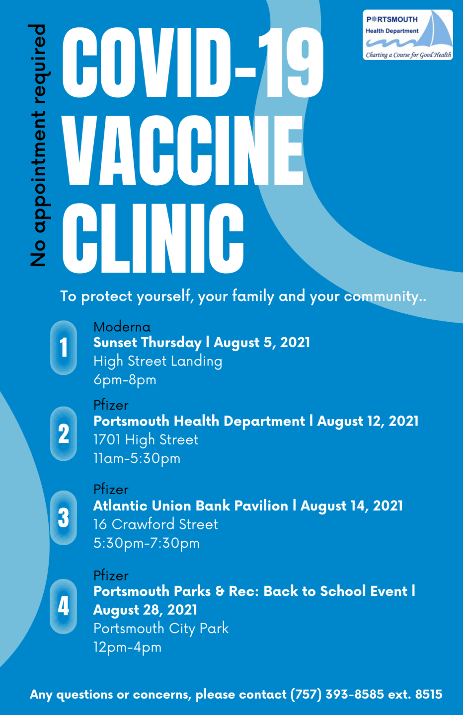 WAVY The Portsmouth Health Department has released a schedule of upcoming COVID-19 vaccination clinics. Portsmouth Health Department continues to work with the VDH and CDC to respond to the outbreak of COVID-19. 757393-8585 Monday through Friday 800AM to 430PM.