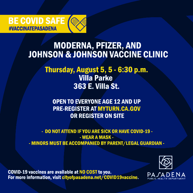 For more information please call 1-877-570-9779. The Pasadena Public Health Department will provide COVID-19 vaccines at Washington Park.